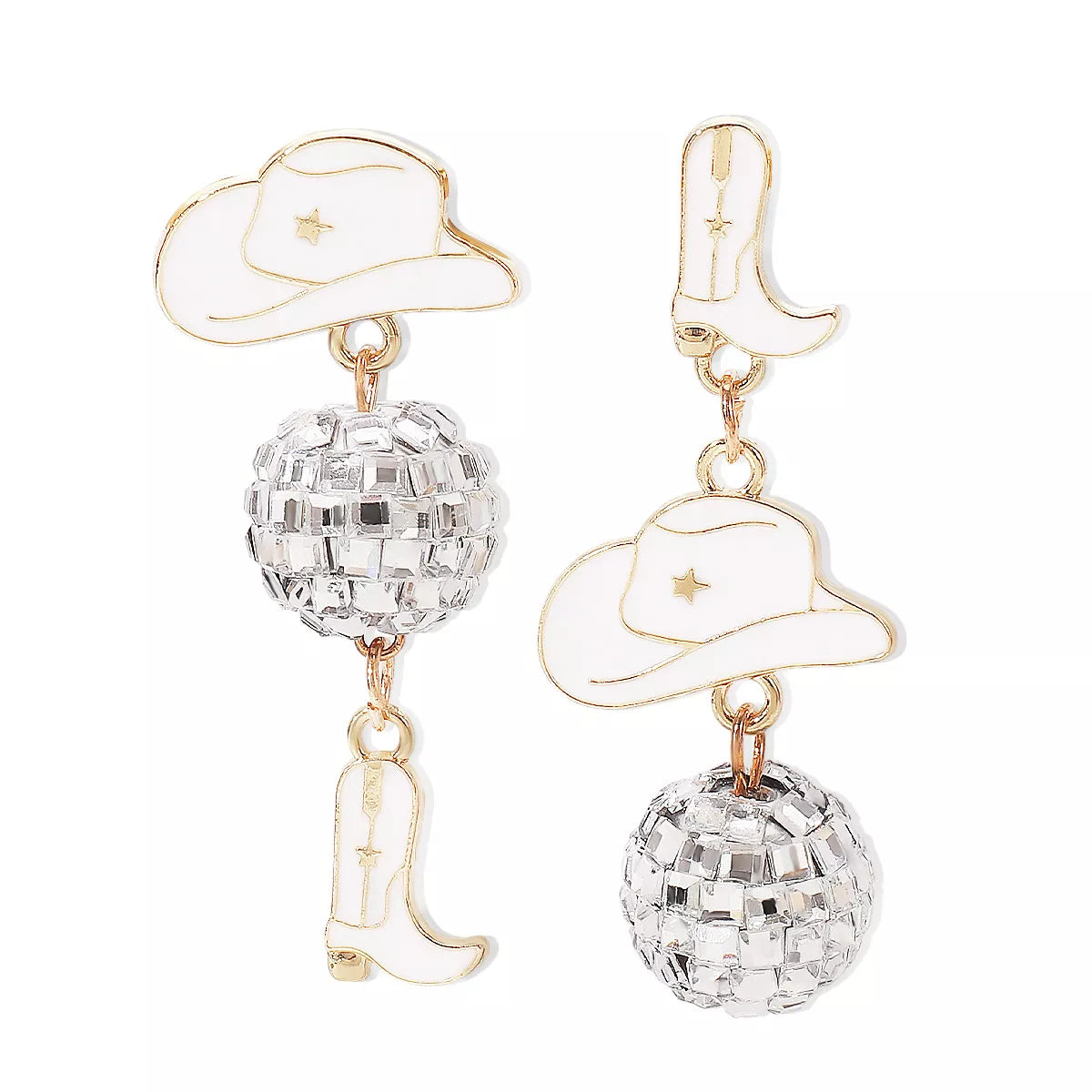 Asymmetrical Cowgirl Boot Hat Ball Dangle Earrings