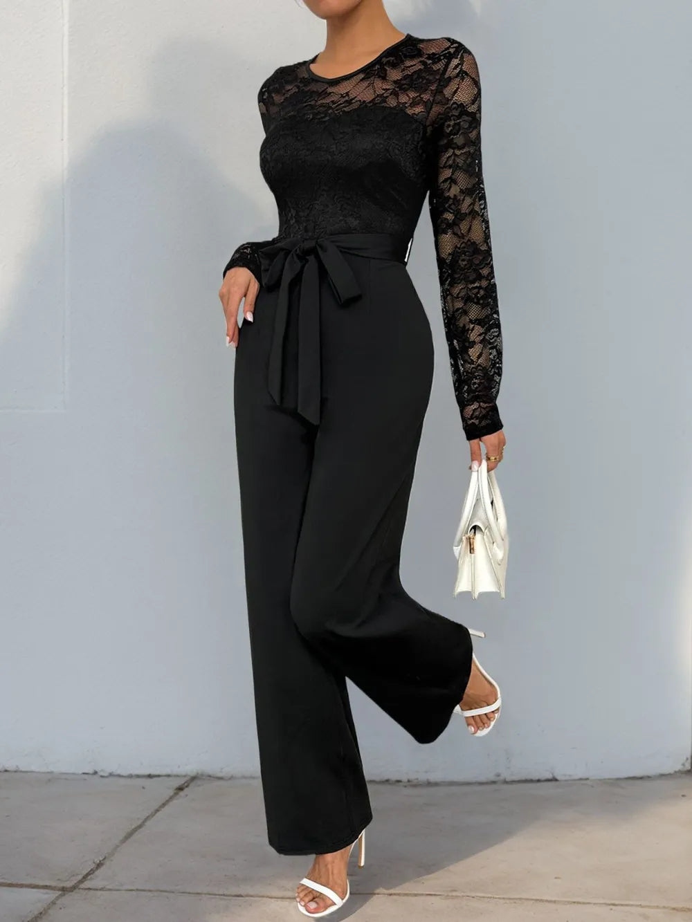 Perfee Lace Round Neck Long Sleeve Jumpsuit